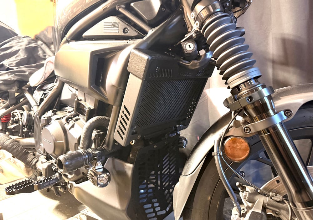 Clean up the front end of your Honda Rebel 1100 with a purpose-built radiator shroud designed and manufactured in-house by RebelForm. This shroud adds a sleek, aggressive look while helping shield your radiator from road debris—without restricting airflow.